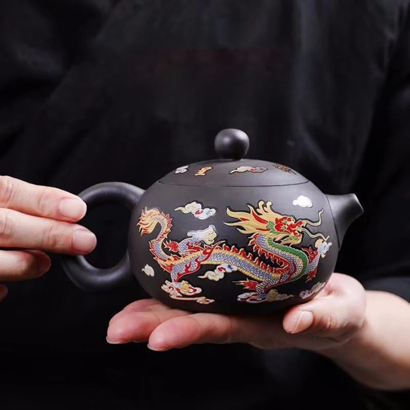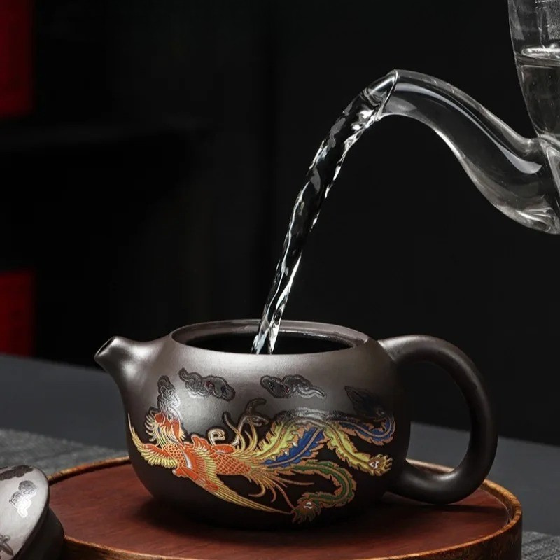 Produzido com a autêntica argila roxa de Yixing, este trabalho artesanal carrega séculos de tradição e refinamento. Cada peça é moldada à mão por artesãos experientes, garantindo um acabamento único e duradouro. Os delicados símbolos de dragão e fênix, presentes no design, representam prosperidade, harmonia e equilíbrio, tornando o item não apenas funcional, mas também um amuleto cultural repleto de significado.