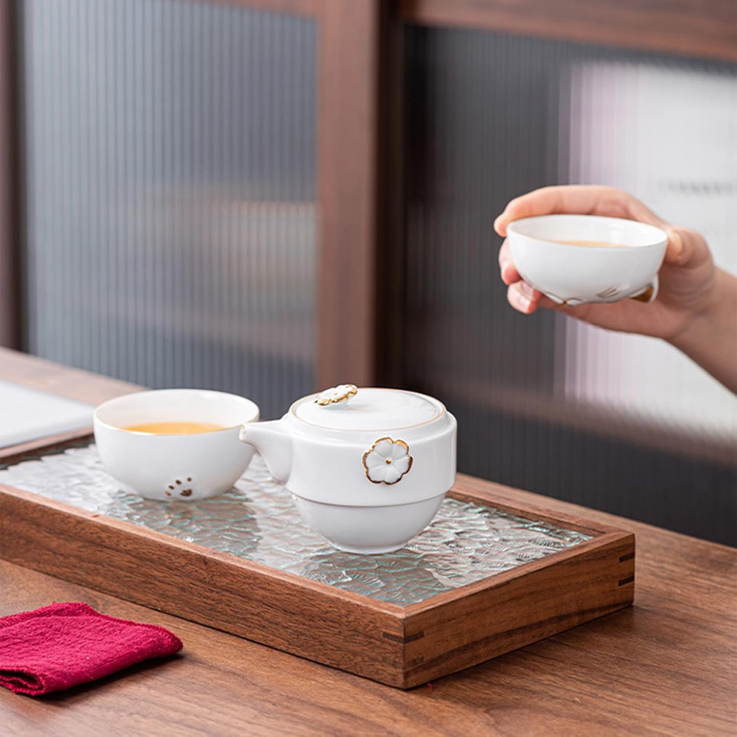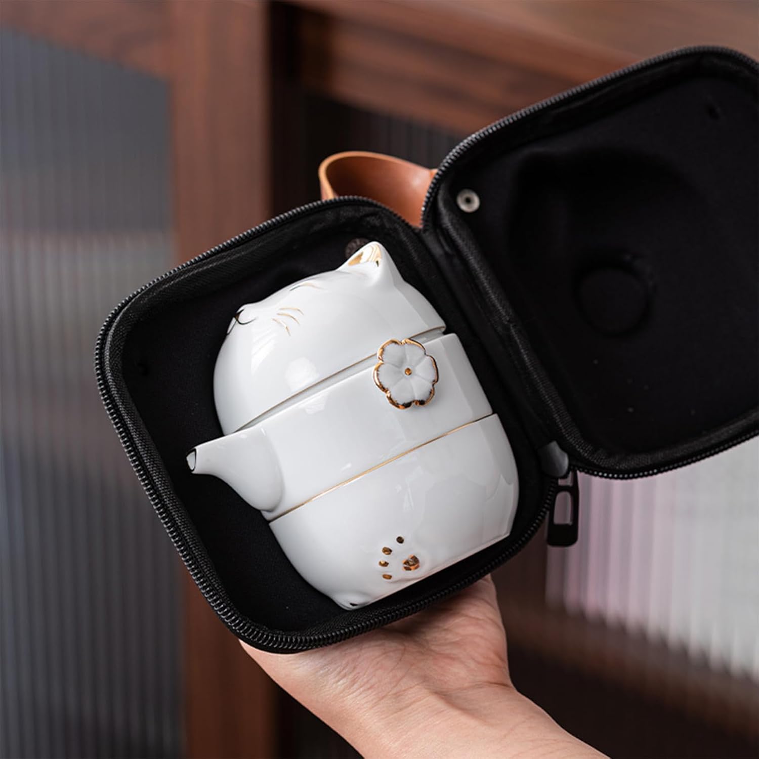 Protege todo o conjunto com segurança e estilo. Ideal para levar o seu ritual de chá onde quiser — seja em viagens, encontros ou no trabalho — sem ocupar espaço e sem riscos de quebra.