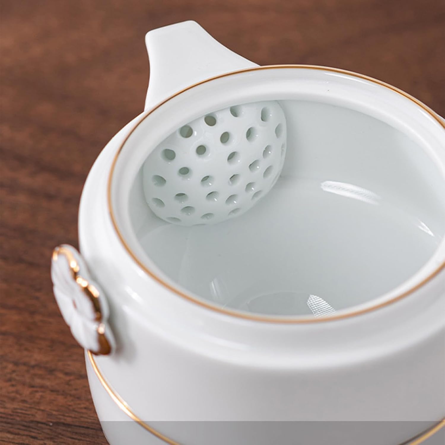 O bule traz um sistema de filtragem embutido com pequenas esferas internas, que garantem uma infusão suave e limpa — sem resíduos de folhas no fundo da xícara. O bico curto e delicado permite um servir preciso, enquanto a tampa com detalhe de flor de ameixa adiciona um toque sutil de poesia à peça.